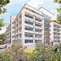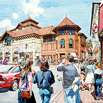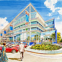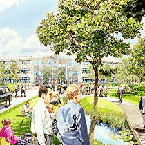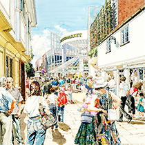 It was here that a life long friendship started with another ex Twickenham student 'Ken Dallison', we influenced each other greatly in our early years, it is true that neither of us would be where we are today without the other. We both did the graphic designer thing in London agencies, before going freelance and working together with work for Ford on the105E Anglia and the MkII Zephyr convertibles, I did the cars Ken did the backgrounds, as well as Ford we were doing work with Massey Fergusson agricultural machines. Eventually a break was needed, Ken went back to New York and I started a 2 year pan european ad campaign for Ford Europe, working through ad agency JWT (J. Walter Thompson) in Antwerp and Amsterdam, work followed from Aston Martin, Vauxhall, Honda, International Harvester and Shell Aviation, the Shell drawings went on a world exhibition staged by I.A.T.A while the Honda illustrations led to a commission to do perspective drawings for the fledgling Milton Keynes, with this came a change of direction from advertising illustration to architectural illustration, that was 30 years ago and much work followed with BDP, Conran Roche, Leslie Jones and Reid Associates etc this was a very rewarding period for me architects generally are sympathetic people to work with and appreciative of the contributions an artist can bring to the table, I am still being asked to help on projects having just finished five illustrations for BDP on St. James Edinburgh, the historic towns and cities still like a hand rendered illustration over a computer generated one.