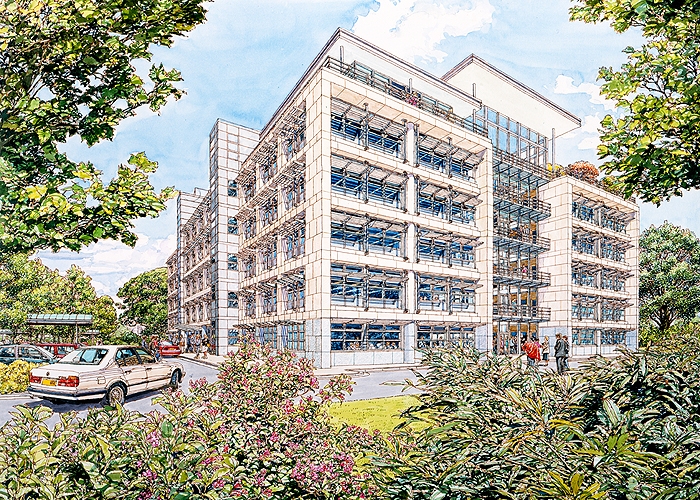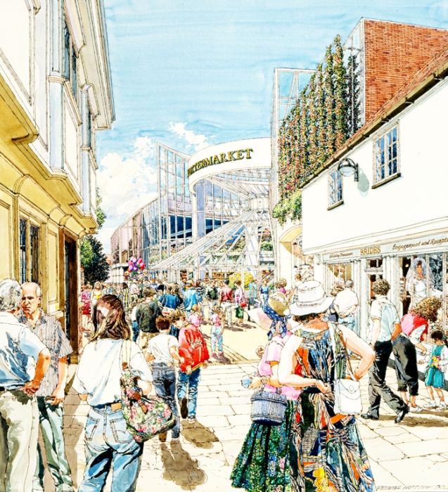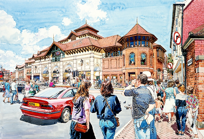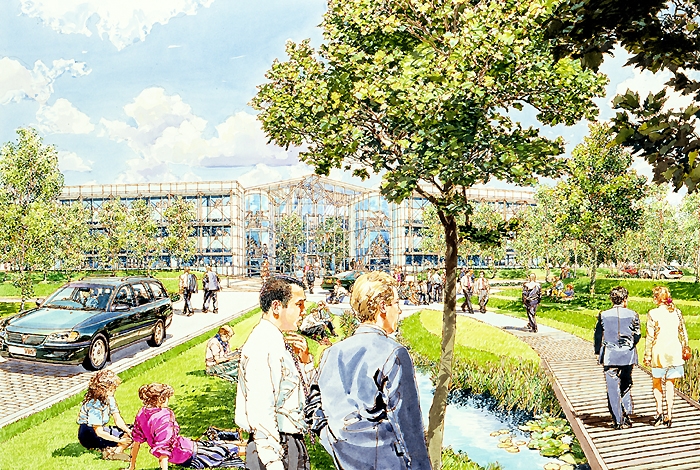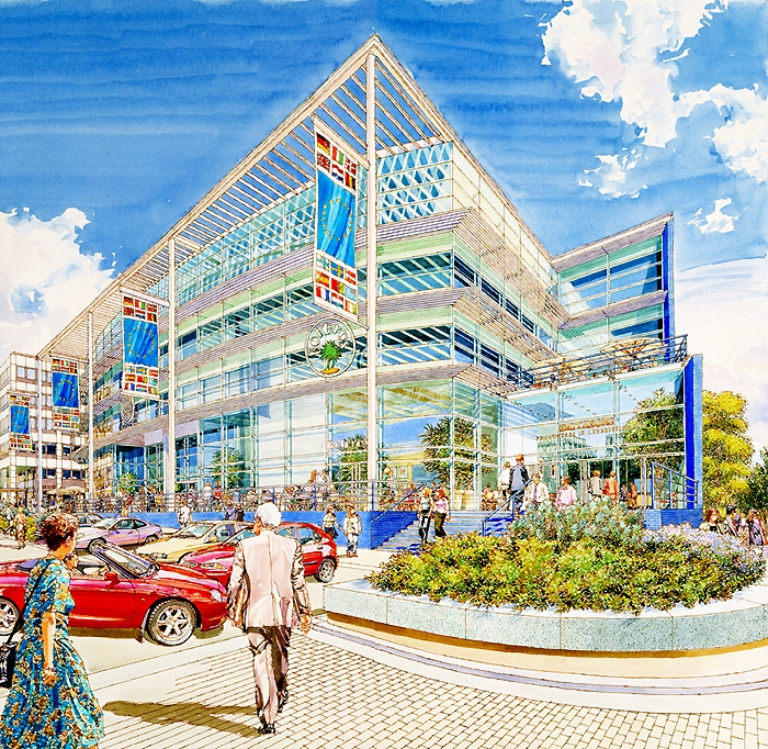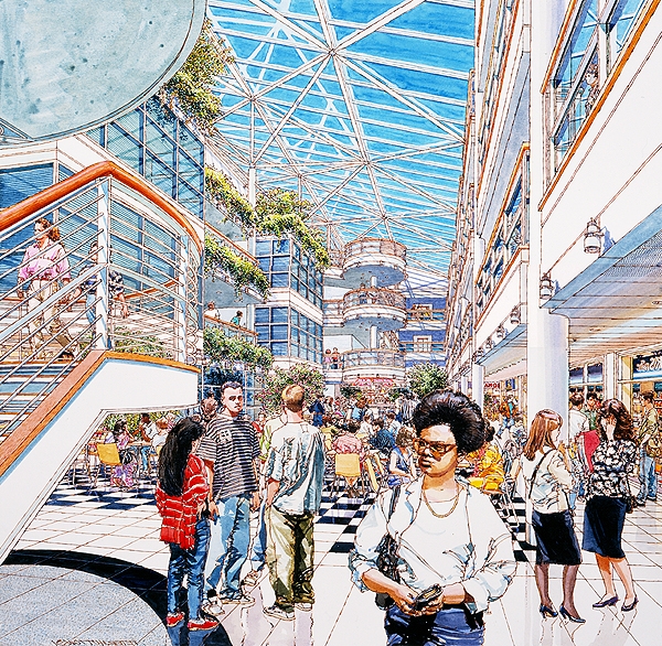 It was here that a life long friendship started with another ex Twickenham student 'Ken Dallison', we influenced each other greatly in our early years, it is true that neither of us would be where we are today without the other. We both did the graphic designer thing in London agencies, before going freelance and working together with work for Ford on the105E Anglia and the MkII Zephyr convertibles, I did the cars Ken did the backgrounds, as well as Ford we were doing work with Massey Fergusson agricultural machines. Eventually a break was needed, Ken went back to New York and I started a 2 year pan european ad campaign for Ford Europe, working through ad agency JWT (J. Walter Thompson) in Antwerp and Amsterdam, work followed from Aston Martin, Vauxhall, Honda, International Harvester and Shell Aviation, the Shell drawings went on a world exhibition staged by I.A.T.A while the Honda illustrations led to a commission to do perspective drawings for the fledgling Milton Keynes, with this came a change of direction from advertising illustration to architectural illustration, that was 30 years ago and much work followed with BDP, Conran Roche, Leslie Jones and Reid Associates etc this was a very rewarding period for me architects generally are sympathetic people to work with and appreciative of the contributions an artist can bring to the table, I am still being asked to help on projects having just finished five illustrations for BDP on St. James Edinburgh, the historic towns and cities still like a hand rendered illustration over a computer generated one.