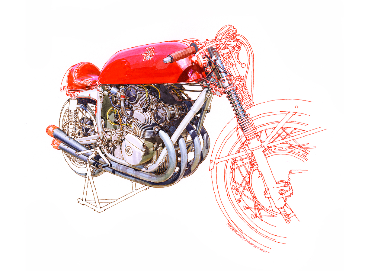 From an original drawing by Peter Hutton with many thanks to Peter Jones for access to photograph and draw his MV Augusta and his roll of film at the crucial moment.