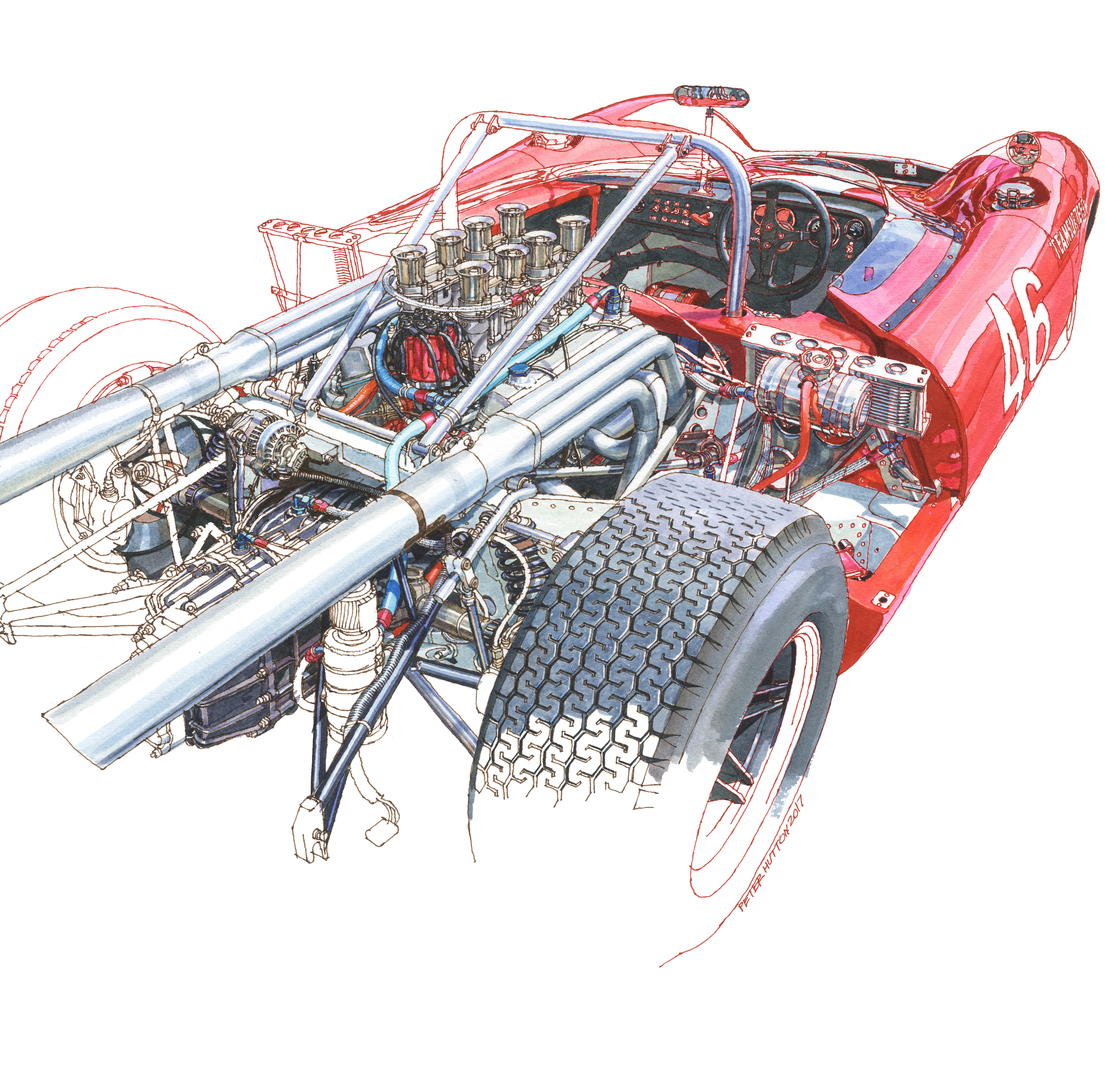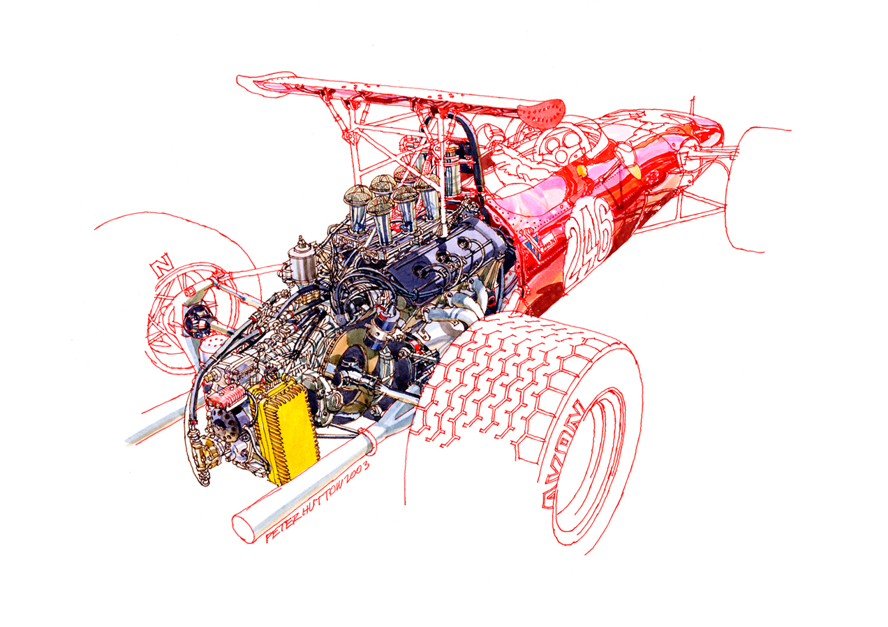 From an original drawing by Peter Hutton with many thanks to Dudley and Sally Mason-Styrron for their help and access to their Tasman Ferrari.