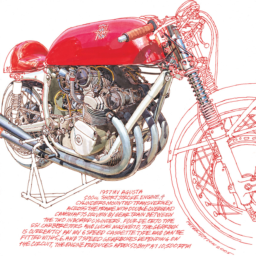 from an original drawing by Peter Hutton with many thanks to Peter Jones for access to photograph and draw his MV Augusta and his roll of film at the most crucial moment.© 2010.