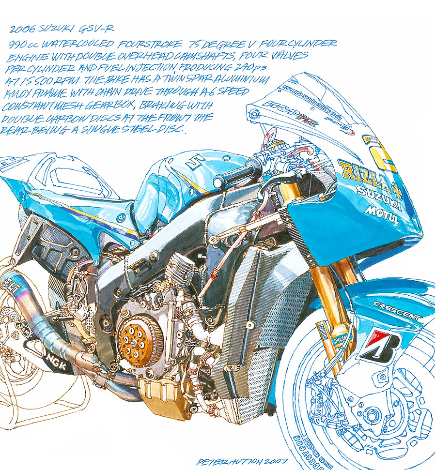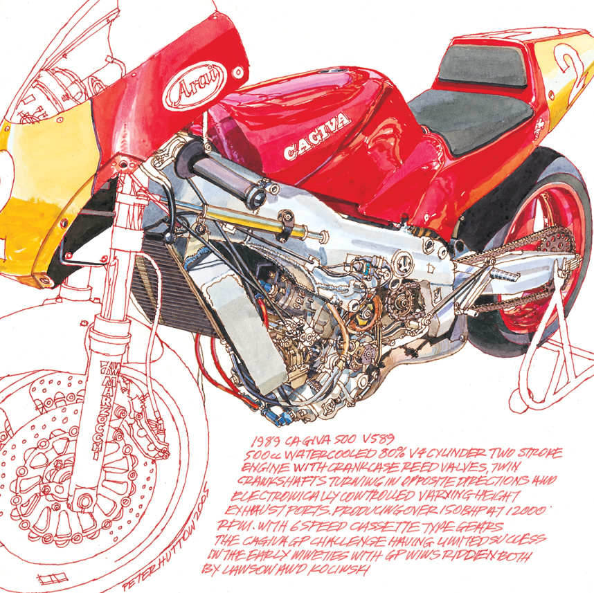 from an original drawing by Peter Hutton again with many thanks to Chris Wilson for giving me the opportunity to sketch and photograph his V4 Cagiva.© 2010.