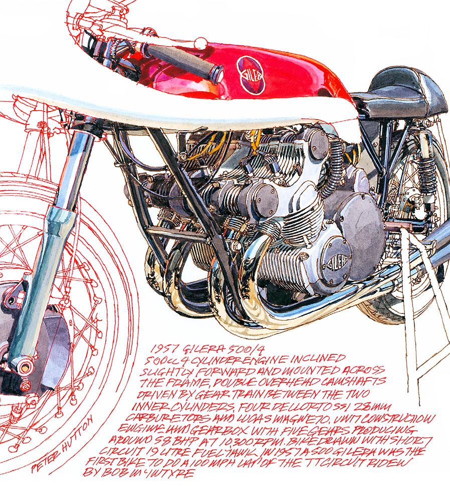 From an Original drawing by Peter Hutton with many thanks to Peter Jones for giving me the opportunity to draw his Gilera and for always being so helpful and approachable.© 2010.